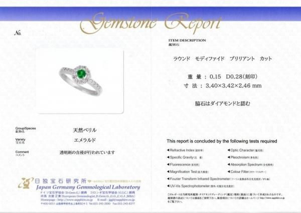 エメラルド ダイヤモンドリング EM 0.15ct D 0.28ct Pt950 日独宝石研究所鑑別書付
