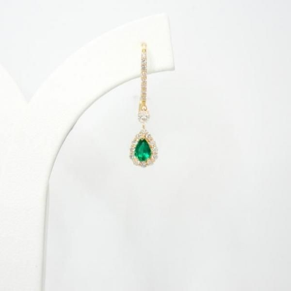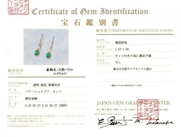 エメラルド ペアシェイプダイヤモンド ジプシーピアス EM 0.21ct 0.22ct D 0.54ct K18YG JGGC鑑別書付