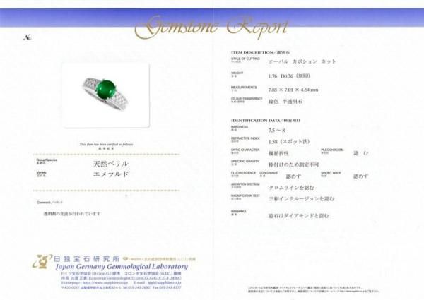 〜 コロンビア産カボションエメラルド ダイヤモンドリング EM 1.76ct D 0.36ct Pt900 日独宝石研究所鑑別書付 〜