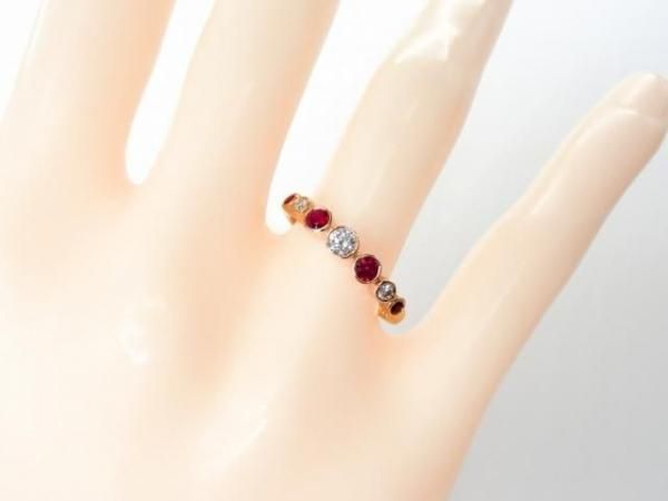 リングはダイヤモンドとルビーを交互にセッティングした華やかなデザイン。