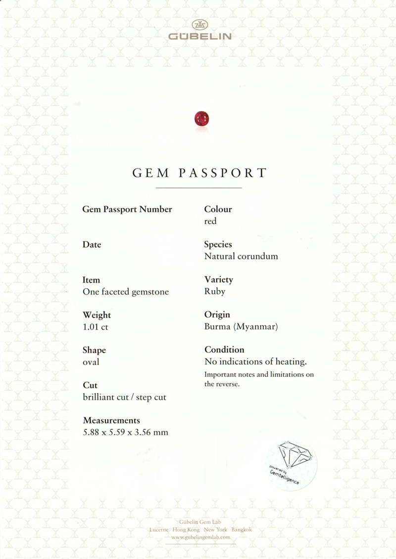 ミャンマー産非加熱ルビー R 1.01ct Gubelin鑑別書付